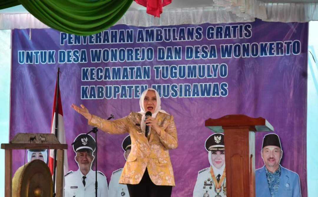 MUSIRAWAS – Bupati Musi Rawas, Hj Ratna Machmud menyerahkan bantuan Ambulans Desa di Lapangan Sepak Bola, Q2 Wonorejo, Kecamatan Tugumulyo, Kamis (5/9/2024).
